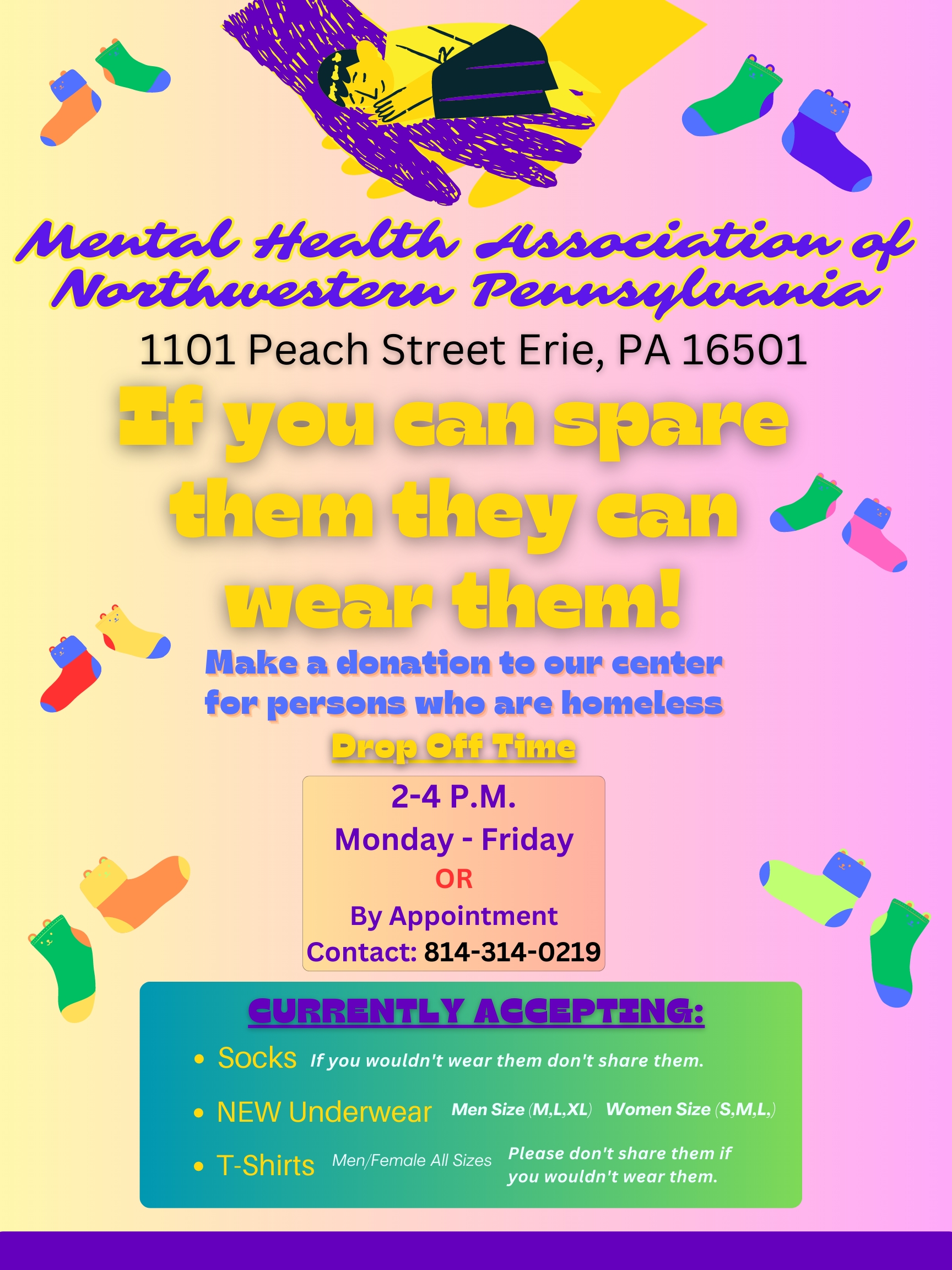 Make a donation to our center for persons who are homeless. We are currently accepting: servicable socks, t-shirts all sizes M/F, new underwear Mens M,L,XL and Womens S,M,L. If you wouldn't wear them, don't share them.